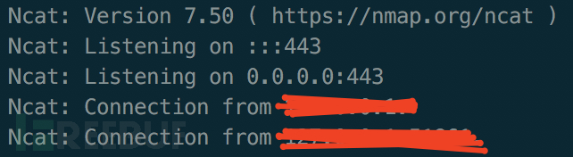 使用以下命令我连接到了服务器侦听端,这里我花了很长时间来确定连接端口,最终确定为443,因为服务器允许访问该端口。