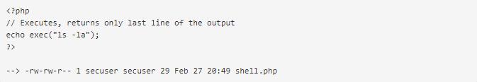 exec()功能是将命令作为参数,但不输出结果。如果指定了第二个可选参数,则返回结果为数组。否则,如果回显,只显示结果的最后一行。