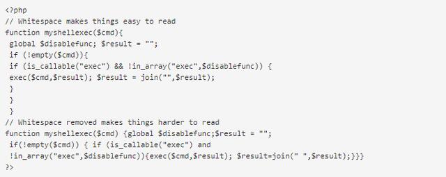 通过从代码块中删除空格换行符,代码看起来像一个大字符串,这就使得代码的可读性降低并且更难识别脚本要实现什么目的。
