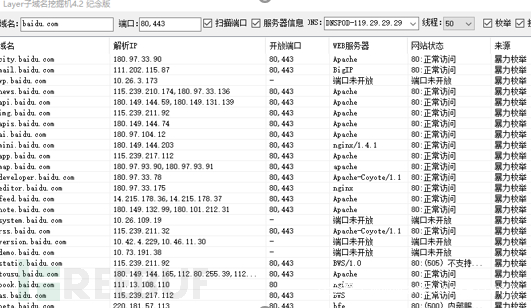 子域名,是顶级域名(.com、.cn、.top)的下一级,域名整体包括两个“.”或包括一个“/”。如:百度顶级域名为baidu.com。其下有news.baidu.com、tieba.baidu.com、zhidao.baidu.com等子域名。收集子域名可以很大程度知道目标所拥有的网站等资产信息。