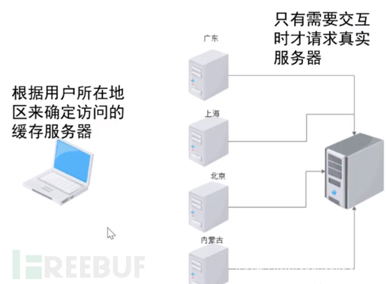CDN全称是Content Delivery Network,即内容分发网络。其原理如下:某些大型网站在全国都会有很多用户,这些用户常常会向网站发送不同的请求,那么不同地域会具有不同的缓冲服务器来接收用户发送的流量。如果用户发送流量没有任何交互的数据,只是请求首页的话,此时根据用户所在地区来确定访问的高速缓存服务器,高速缓存服务器会返回对应的响应到用户的浏览器当中,比如广东。