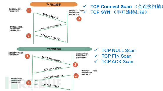 主流的扫描方式:利用TCP面向连接三次握手、四次挥手过程包,UDP非面向连接请求。