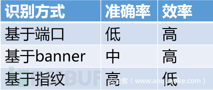 识别端口上运行的服务,识别方式有基于端口、基于banner和基于指纹三种。