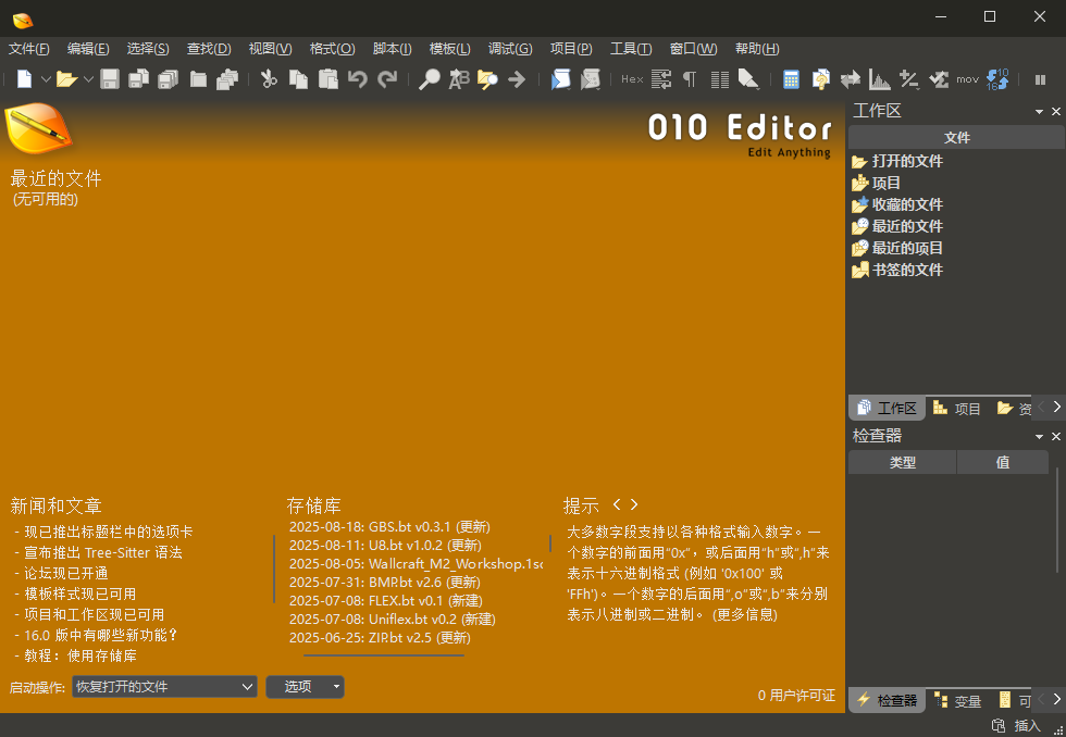 010 Editor 是专业的十六进制编辑器,支持编辑源码文本和二进制文件,拥有二进制模板、可视化分析工具、自动执行脚本等特色功能。